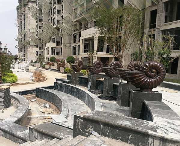優(yōu)藝園林雕塑制作的這組小區(qū)銅海螺噴泉組合水景,整體采用純黃銅原材,純手工鑄造完成,